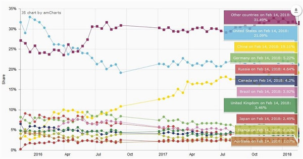 根据amCharts统计的图表,截止到今年2月底,《彩虹六号》当中中国玩家数量占比已经达到19.11%,仅次于美国的21.09%。