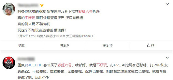 这可能与《彩虹六号》中国玩家故意的“反向营销”有关,不少中国玩家担心新手用户大量涌入,导致游戏同样出现大量开挂者影响游戏体验的现象,因此不惜在各大社交媒体故意“抹黑”游戏,告诉普通玩家敬而远之。