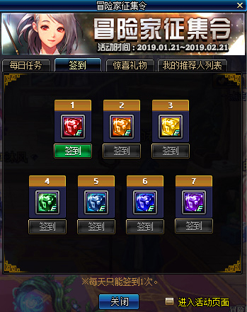 这个活动玩家可以输入帮助自己的冒险家QQ号,当然如果玩家是独行侠也可以输入888888,在奖励方面,包括了签到奖励等,签到奖励当中包括了:辅助装备任务完成券、魔法石任务完成券、耳环任务完成券等。这些任务完成需要耗费大量的金币,而玩家如果得到这些完成券,则可以轻松GET完成,让一些囊中羞涩的玩家可以让自己的最佳实力在95级的升级路上做好准备。