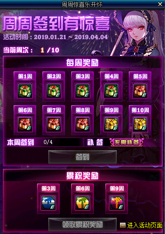 活动分为每周签到奖励和累积签到奖励。奖励方面有黎明裂缝通行证、LV95级哈林史诗武器自选礼盒、第10期稀有装扮自选礼盒(1部位)。