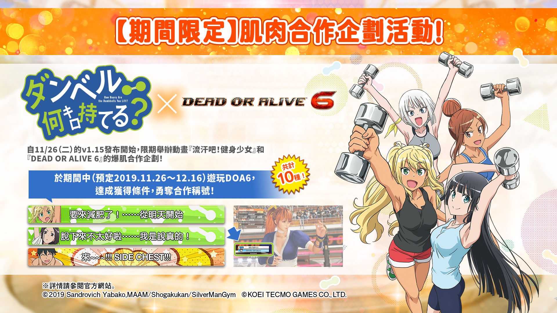 台湾光荣特库摩宣布,激斗娱乐游戏《死或生6》(PlayStation 4/Xbox One/Steam)推出DLC“香汗淋漓!训练服”。此外,“基本免费版200万DL纪念服装”第1弹、动画“流汗吧!健身少女”合作称号也同时于今起发布。