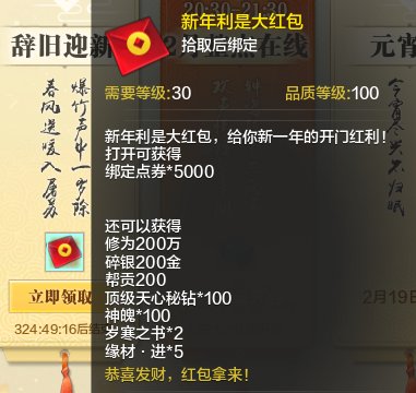 在指定活动时间上线即可获得新年利是大红包!打开可以获得5000绑定点券、岁寒之书等大量丰厚奖励哟~