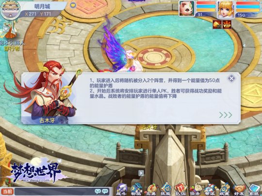 明月城每两周会举行一次单人比武大会,进行相互对抗作战。进入活动后玩家会随机分配到两个阵营,并得到50点能量护盾,双方阵营通过单人pk削弱对方能量护盾,获得能量水晶和战功.