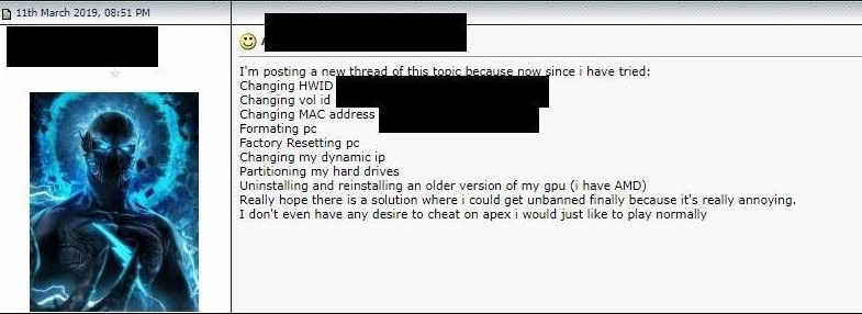 随后他尝试了重装系统、更换硬件ID、更换硬盘序列号、更换MAC地址、格式化电脑、恢复电脑出厂设置、更换动态IP、重新对硬盘分区、重装更旧版本的显卡驱动等诸多方法,但是依旧会在更换新账号后30分钟内被封禁。作弊者甚至最后表示,自己已经没有任何想要在《Apex》里作弊的欲望了,只想正常地玩