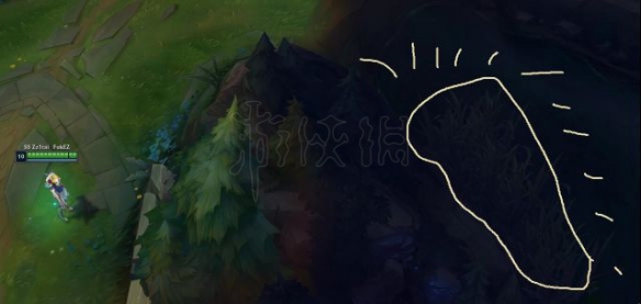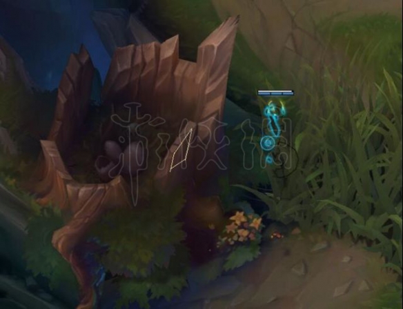 三角草的位置如亮线标记所示。这个方法适用于从蓝方上路向红方三角草做眼时使用。(对于红方而言也可以在兵线推过河后,插的防备眼)