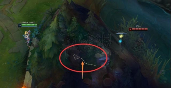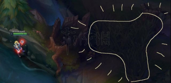如下图所示。用亮线圈出来的草丛是需要点亮的地方。一般推荐在被压线过不去河道时采取这个方法。
