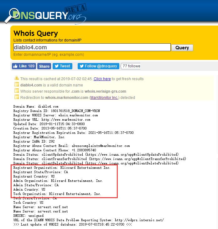 从域名查询网站dnsquery上可以看到,目前“diablo4.com”这个域名的注册/管理/技术公司都是暴雪娱乐,因此可以预见到的是暴雪已经开始为这方面做准备了。