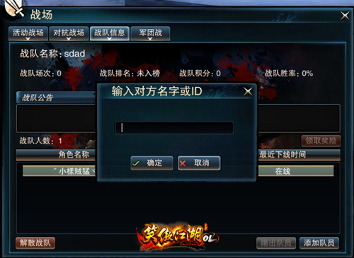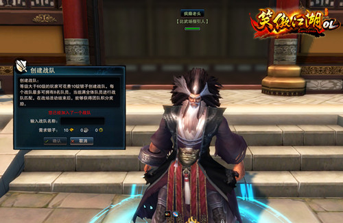 玩家可在洛阳城NPC疯癫老头(332 ,110)处花费一定金币进行战队的创建,然后点击屏幕左上角战场按钮,可在分栏找到战队信息。在战队页面可通过添加好友角色ID邀请加入战队,一个战队最多可有8名成员。队员集结后,可在商城购买2019称号礼包,在比赛时间内佩戴称号即可参赛。