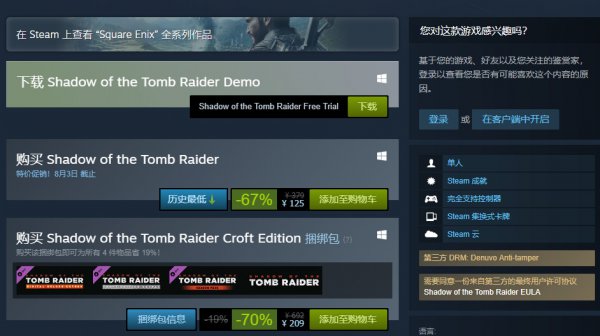 目前《古墓丽影:暗影》正在Steam国区进行降价67%促销,原价379现仅需125元,感兴趣的玩家可以前去购买。