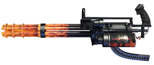 加特林-终结:凶猛的机枪之王——手持M134转管机枪终结者主题纪念版。枪膛处印有终结者专属标志,枪管处的火焰设计似乎要燃尽一切邪恶势力。