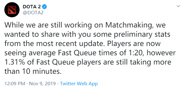 “虽然我们依然在为匹配模式进行工作中,我们想与你们分享一些最新的初步统计数据。玩家目前在【快速匹配(Fast Queue)】的平均匹配时间为1:20,然而有1.31%的【快速匹配】玩家依旧需要花费超过10分钟。”
