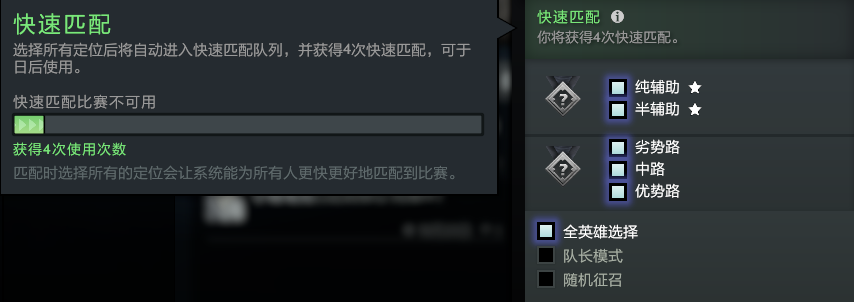 《DOTA 2》中的天梯【快速匹配】,即是在排队前选择所有的位置或是【纯辅助/半辅助】两个高需求位置,这样玩家就可以进入到【快速匹配】队列中,并且还可以获得4次可供日后使用的【快速匹配】资格;反之如果玩家只选择单独的位置就会进入【慢匹配】。