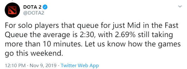另外《DOTA 2》官方也表示,在【快速匹配】中只选择【中路】玩家的平均匹配时间为2:30,大约有2.69%的玩家需要花费超过10分钟。