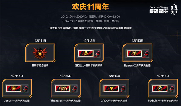活动期间,每天19:00~23:00在8人及以上房间进行游戏,经验获取提升至3倍哦!每天首次登录游戏,都可获得一份专门为11周年而特别设计的专属纪念喷漆或周年庆典彩漆1份。需要注意的是,每天登录领取的彩漆是全然不同的,想要全部收藏的朋友最好定个闹钟,免得因为错过而感到遗憾哦!