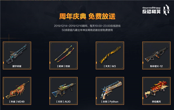 活动期间,每晚19:00~23:00,50余款超凡霸主年神及稀有武器全部免费使用。其中包括了憾宇碎星、【弑神】双剑、【天龙】M3、粉碎者X-12等各种强力年神&霸主武器,让你无论在生化、灾变,还是团战、竞技都能有很好的游戏体验!