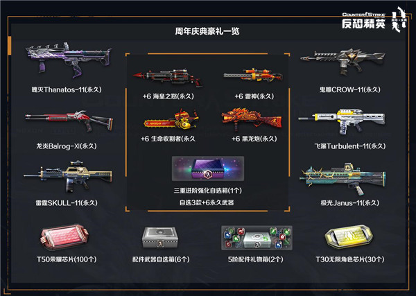 活动期间,每天在游戏内完成指定的周年庆典活动任务,即可获得对应活跃度。依据活动期间累计的活跃度,可以分别解锁大量的高价值游戏道具哦!不仅各种高价值芯片及永久武器拿不停,更可以获得三重进阶强化自选箱,选择获取3款+6永久武器哦!