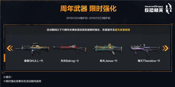 活动期间, 11周年庆典彩漆涂装武器全部限时强化至超凡武器级别。该系列武器可通过各种周年活动永久获得哦!大家赶紧到游戏中好好体验一番周年武器的魅力吧!