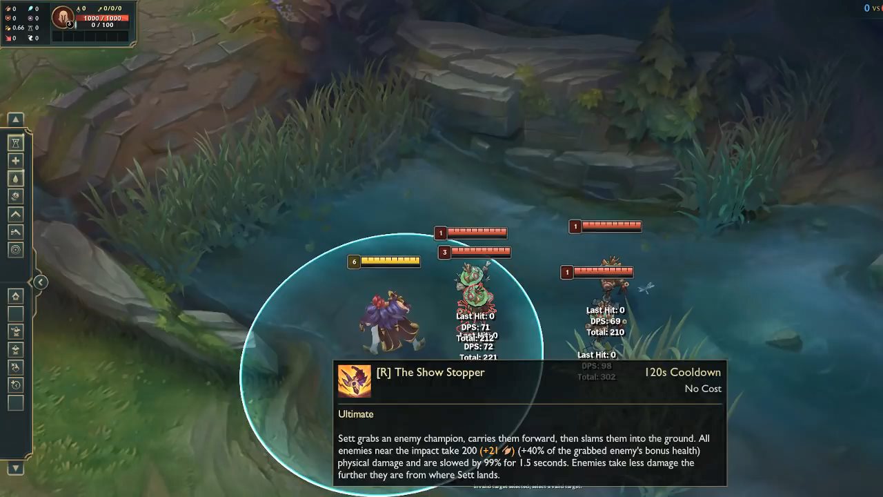 R技能:瑟提擒住1名敌方英雄,扛着该英雄前进,并将其猛摔到地上,着陆点附近的敌人相应物理伤害并被减速,持续1.5秒,离着陆点越远,受到伤害越低。