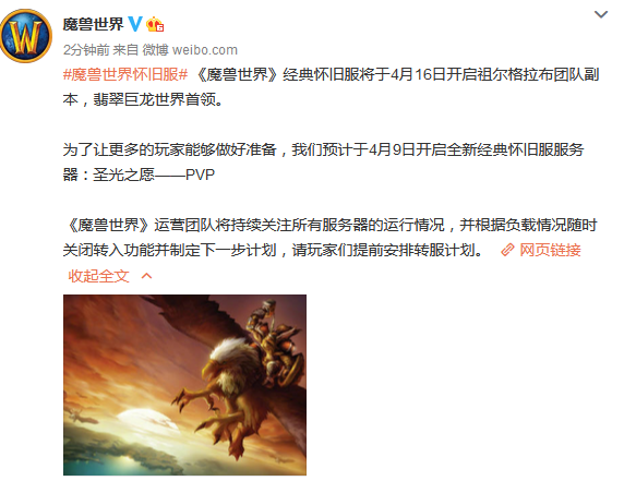官方表示:“《魔兽世界》经典怀旧服将于4月16日开启祖尔格拉布团队副本,翡翠巨龙世界首领。为了让更多的玩家能够做好准备,我们预计于4月9日开启全新经典怀旧服服务器:圣光之愿——PVP《魔兽世界》运营团队将持续关注所有服务器的运行情况,并根据负载情况随时关闭转入功能并制定下一步计划,请玩家们提前安排转服计划。”