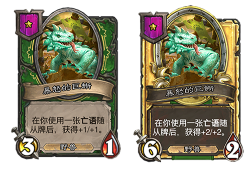 [等级1,野兽]3点攻击力,1点生命值。在你使用一张亡语随从牌后,获得+1/+1。