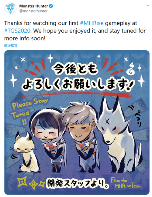 今日,《怪物猎人:崛起》在其社交账号上发文,对观看此次TGS2020游戏演示的玩家表示感谢。官方还表示:未来将有更多消息发布,请玩家保持关注。