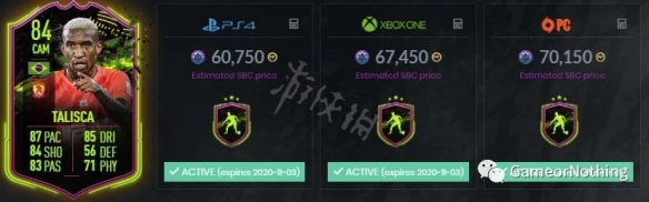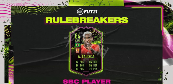 FIFA21 规则破坏者塔利斯卡总评 84 CAM.他这张卡主要是速度提升,速度加了7点。SBC 成本约6万,11月3日到期。