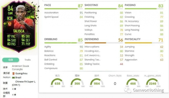 FIFA21 规则破坏者塔利斯卡,游戏内详细数值。