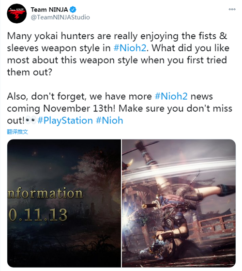 11月13日次时代主机已经发布,或许官方将会带来关于次时代以及《仁王2》完全版的消息。不过Team NINJA在推文中谈到了关于拳脚和袖子式样的武器,因此11月13日大概率也可能会发布关于“太初武秘史”中新武器的情报。