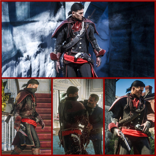 虽然脸和模型还是亚瑟·摩根,但是发型和外套的感觉都有那味了,都是黑红的主色调,就差兜帽和袖剑了。虽然说离真正的完美还原还差些意思,但是亚瑟·摩根这个造型有着满满地谢伊回忆。