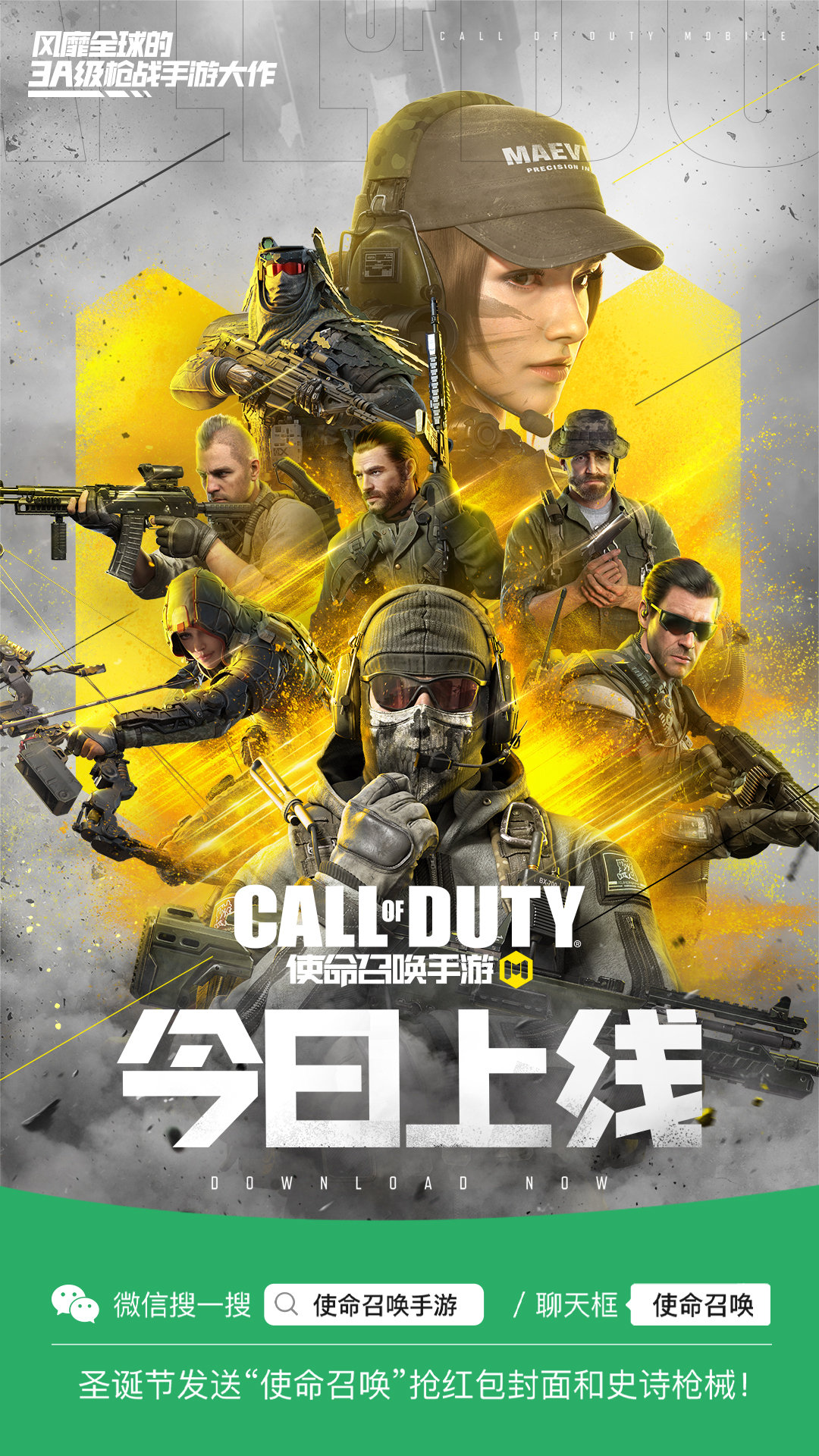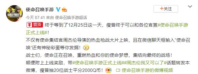 终于等到了12月25日这一天,瘦普终于可以和各位官宣#使命召唤手游正式上线#!不仅有使命集结官周杰伦导演的热血枪战大片上映,且在微信聊天框输入“使命召唤”还有神秘彩蛋等你发掘!战士们,使命正在召唤,重燃热血和你的使命梦想,集结向最终的战场!