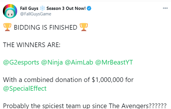此前,《糖豆人:终极淘汰赛》开发商Mediatonic曾在今年早些时候举办了一场特别的“品牌之战”,该活动旨在选出向英国残疾人慈善机构SpecialEffect捐款最多的个人/团体,并为他们打造专属皮肤。