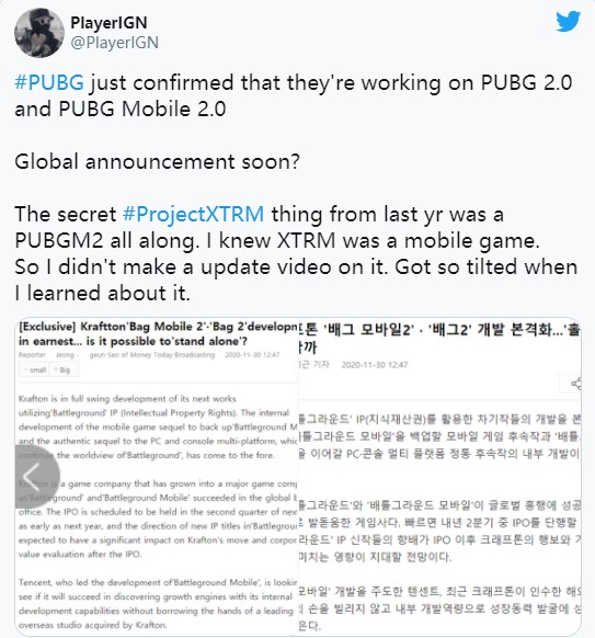 据知名爆料者PlayerIGN在推特上透漏,Krafton正在开发续作,包含PC、主机端《绝地求生2》和移动端《绝地求生2.0》。PlayerIGN在推特上写道:“Krafton正在全力开发下一代《绝地求生》,这款续作将登陆移动端、PC和主机多平台,战火即将继续。”