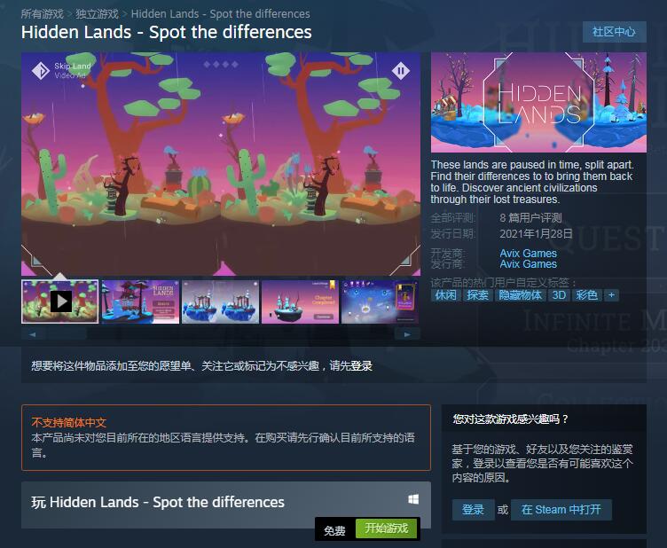 根据官方介绍,《隐土》是一款系统生成的找不同游戏,其艺术风格优美,而且还有着无穷的关卡。目前本作在Steam可以免费开玩。