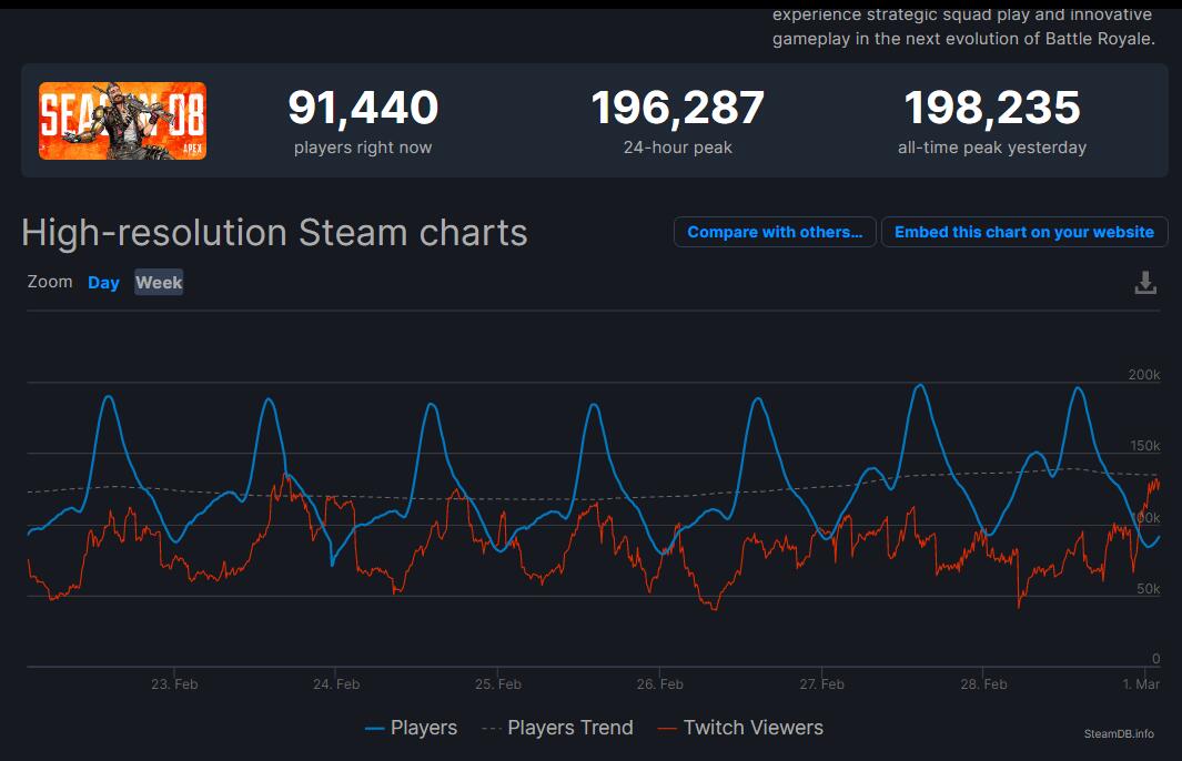 《Apex英雄》Steam 2月的同时在线玩家人数相比上个月大约多7万人。而根据SteamDB的数据显示,这款游戏的玩家人数峰值在2月也打破了纪录,达到了198,235人。