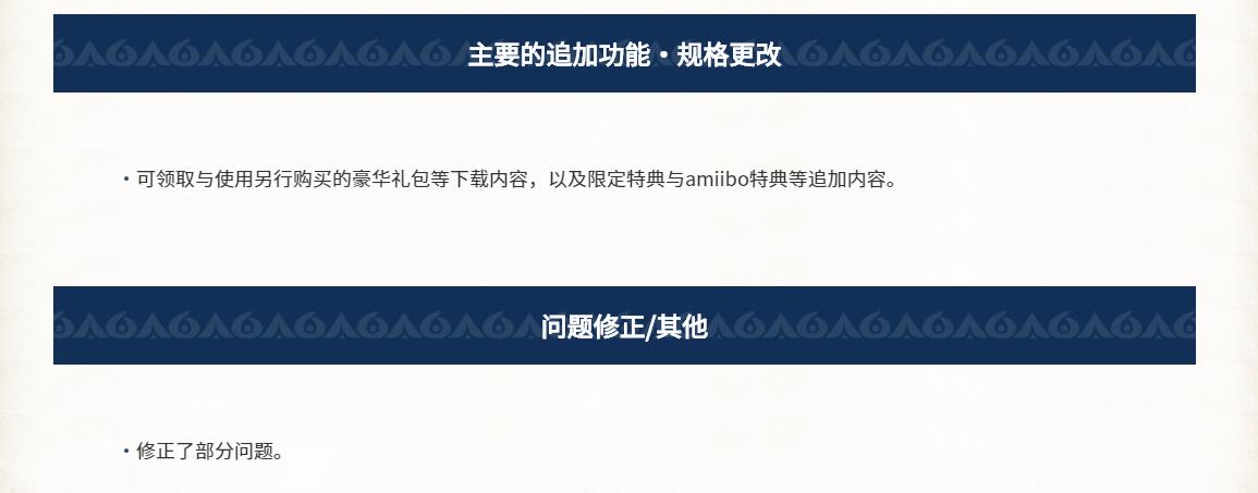 据悉,该首日补丁修正了部分问题,可领取与使用另行购买的豪华礼包等下载内容,以及限定特典与amiibo特典等追加内容。没有太多重要更新。