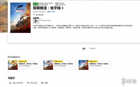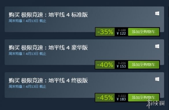 此外,《极限竞速:地平线4》在Win10商店同样开启了促销,售价与Steam平台一致,也为122、153和183元。