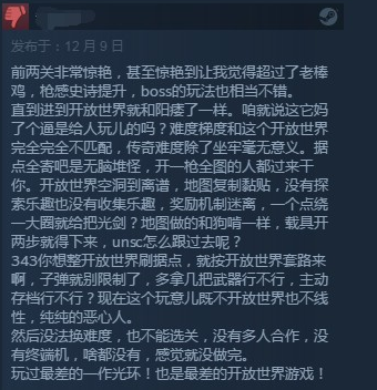 给《光环无限》差评的玩家则表示游戏的开放世界做的不到位、太空洞,剧情不到位等。