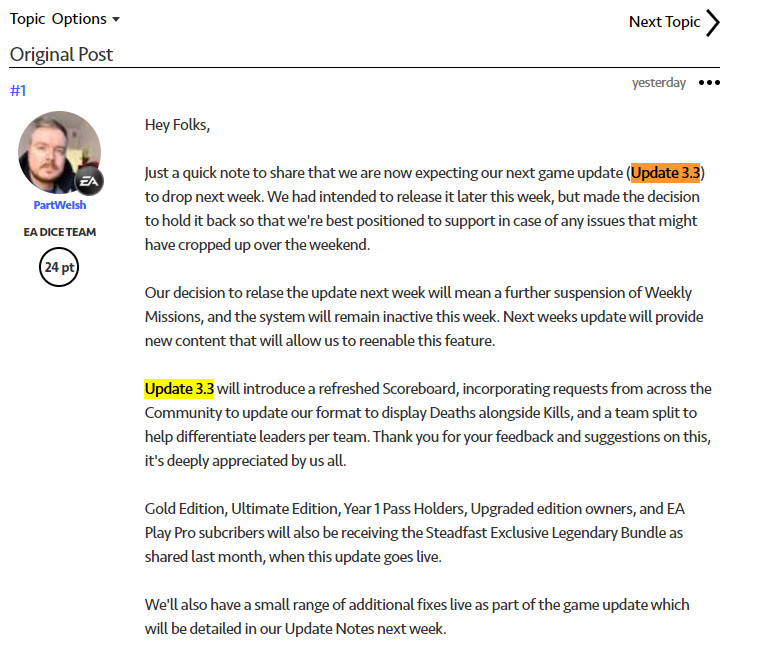 DICE解释说:“我们原计划在本周晚些时候发布(3.3更新),但作出了延期的决定,以便我们能够在周末出现任何问题时提供最好的支持。