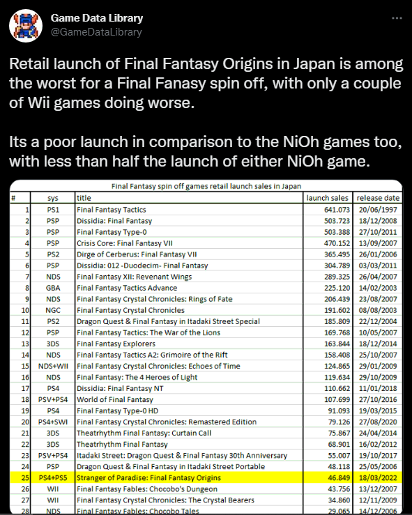 《最终幻想:起源》发售一周,虽然本作有着系列作品的影子,但游戏销量远远没有达到预期,正如追踪日本销售数据的Twitter账户@GameDataLibrary所发布的那样,本作在日本的零售发行非常糟糕,在系列作品中排名倒数第4。