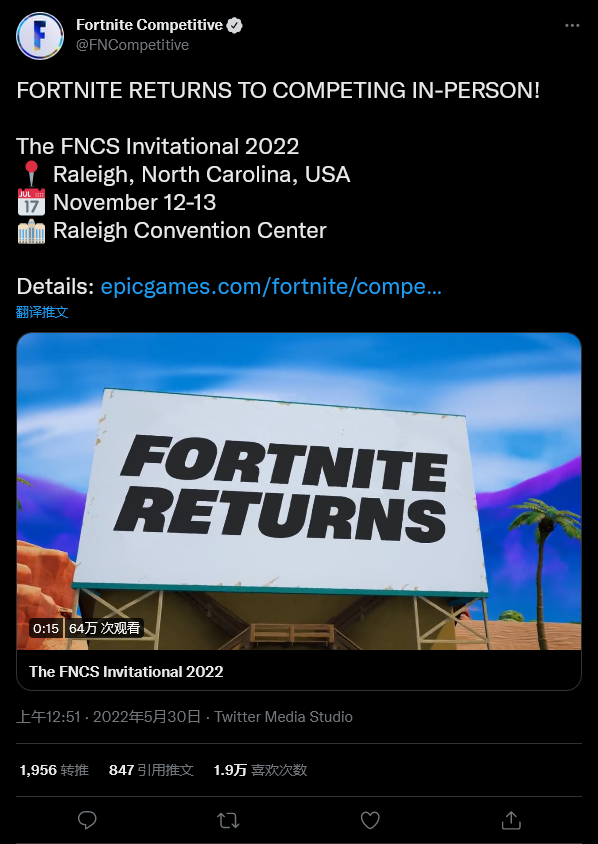 2022 年 FNCS 邀请赛将于 11 月 12 日至 13 日在美国北卡罗来纳州的罗利会议中心举行。 Epic 在一篇由“堡垒之夜团队”署名的博客文章中写道:“我们将邀请来自世界各地的顶级 FNCS 双人队伍,他们将有机会在一个大厅中竞争,分享 1,000,000 美元的奖池。”