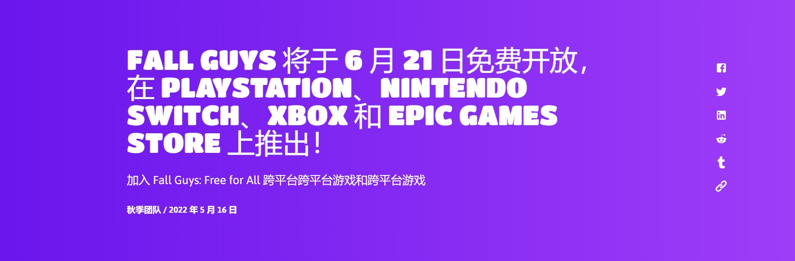 各位豆友们好。我们很高兴与大家分享,很快您就可以在所有平台上免费玩 Fall Guys 了——包括Nintendo Switch™、Xbox™和Epic Games Store™的推出!