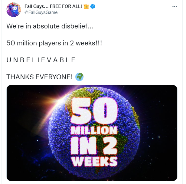 《糖豆人:终极淘汰赛》官方宣布游戏自免费起,两周内,玩家数量突破5000万人,官方表示难以置信。游戏于6月21日起在全平台永久免费,同时首次登陆Switch、Xbox、Epic,支持全平台进度共享与跨平台游玩,并于同日在Steam平台下架,已购买的玩家不受影响。