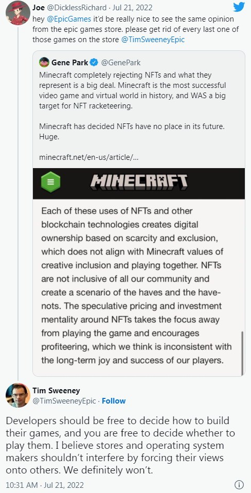 之前《我的世界》开发商Mojang Studios宣布,该游戏不支持或不允许使用NFT和区块链,做出该决定的原因是担心玩家在玩《我的世界》 时造成差距。Epic老板Tim Sweeney却表示,不会在Epic商店禁止销售以NFT为卖点的游戏。