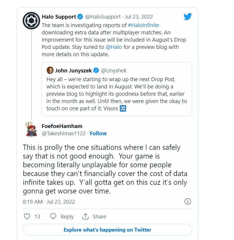 对此,光环客服官推回应说,团队正在调查《光环:无限》在多人比赛后下载额外数据的问题,该问题的修复将在8月的Drop Pod更新中推出。