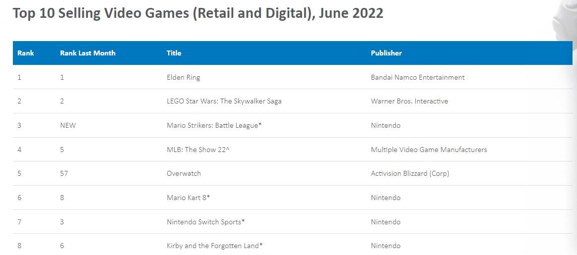 《艾尔登法环》、《马里奥激战前锋:战斗联赛》、《乐高星球大战:天行者传奇》和《MLB: The Show 22》是畅销榜前五名的其他游戏,《艾尔登法环》、《乐高星球大战:天行者传奇》从发售至今一直在榜单前几位,《马里奥激战前锋:战斗联赛》则是近期新作上榜。