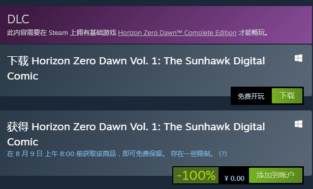 Steam商店页面:https://store.steampowered.com/app/2107510/Horizon_Zero_Dawn_Vol_1_The_Sunhawk_Digital_Comic/