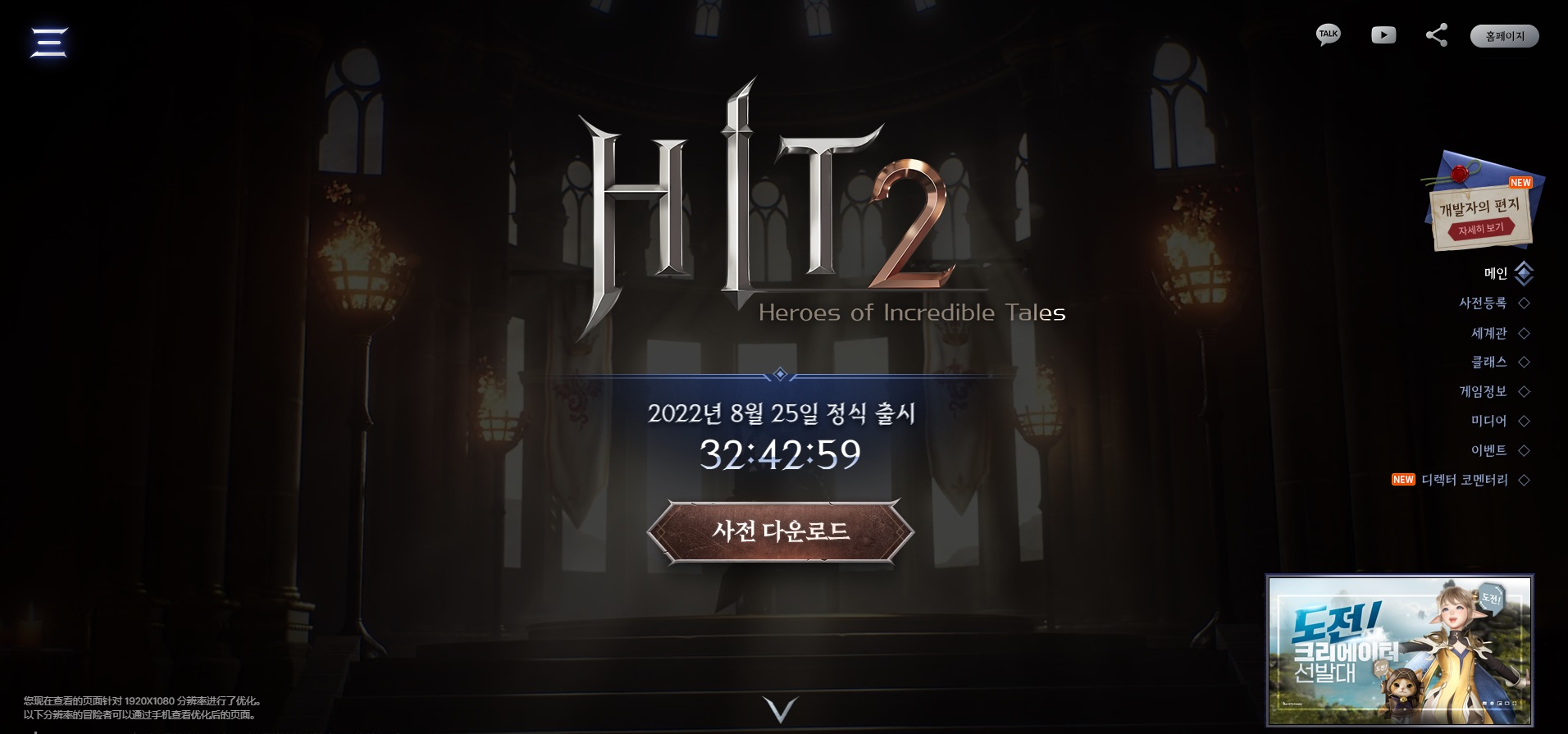 《HIT2》是由NEXON子公司NEXON GAMES开发中的大型MMORPG手游,在继承动作游戏《HIT:我守护的一切》的同时,大幅扩大游戏的内容,以大规模的攻城战,野外战斗为核心。目前,PC端预下载时间为8月18日星期四中午12:00--8 月 24 日(星期三)晚上 11:59。游戏将于8月25日的0时(北京时间8月24日23时)正式上线韩国地区,支持手游和PC双平台登录。