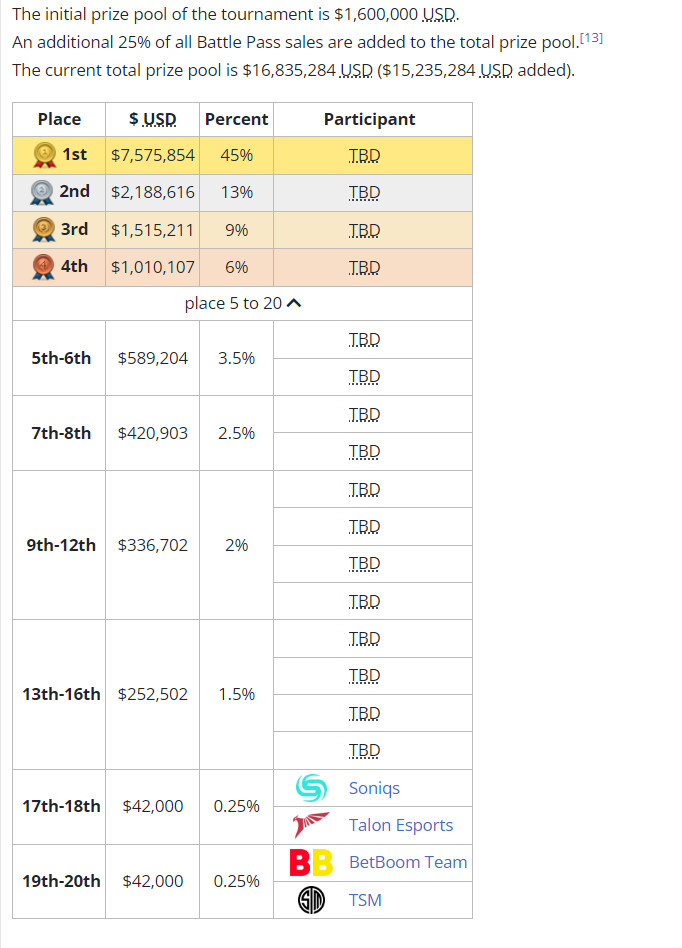 DOTA2 TI11奖金分配细节公开,目前总奖金约为1680万美元,冠军获得45%,亚军和季军分获13%和9%。