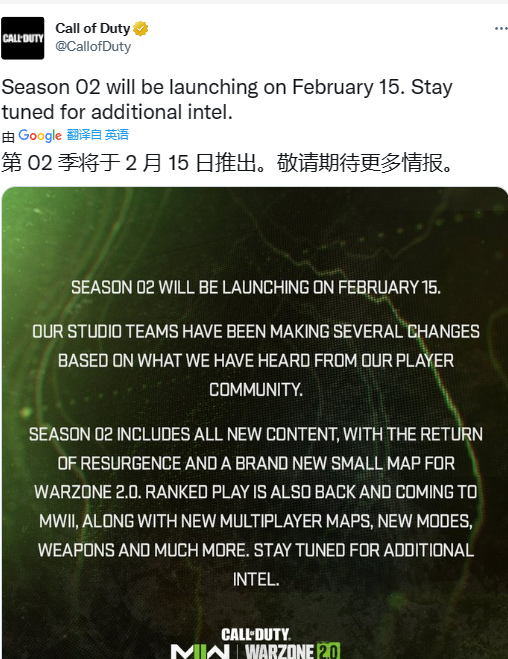 官方表示第二赛季将带来大量新内容,包含 卷土重来模式回归、排位赛模式回归、《战区2.0》小型地图《现代战争2》多人模式的新地图、新武器、新模式等。官方将在之后公布更多细节。