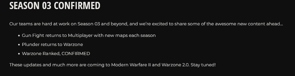 随着《使命召唤19:现代战争2》和《战区2.0》第二季于今天(2 月 16 日)发布,动视同时也预告了季中更新和下一赛季的内容。